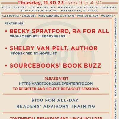 Join the Adult Reading Round Table on Thursday, November 30th for the return of ARRTCon, an all-day readers' advisory conference for library workers. The schedule will include keynotes by Becky Spratford from RA for All and author Shelby Van Pelt. Breakout sessions will be offered on a wide range of readers' advisory topics.